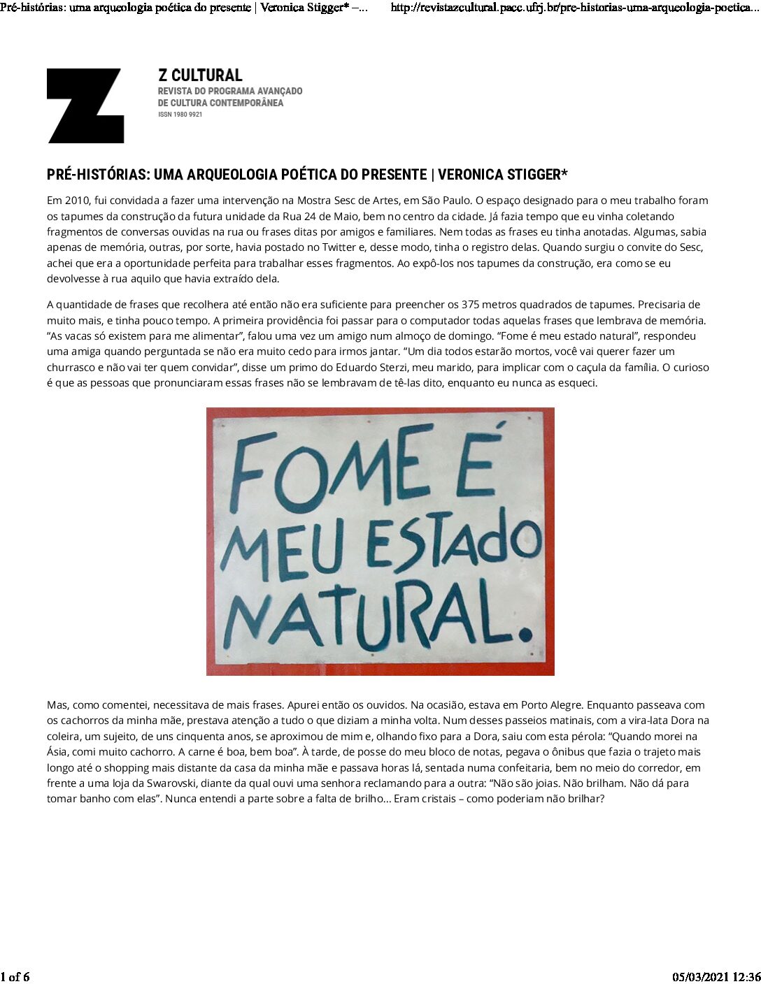 Depoimento de Verônica Stigger, sobre a sua obra, para a Revista Z Cultural Pré-histórias uma arqueologia poética do presente Veronica Stigger – Revista Z Cultural Neste texto, publicado pela Revista Z Cultural, Verônica Stigger fala sobre a sua obra.Baixar